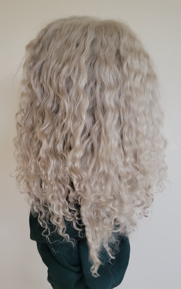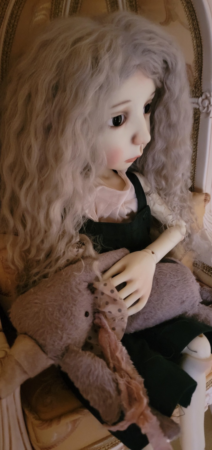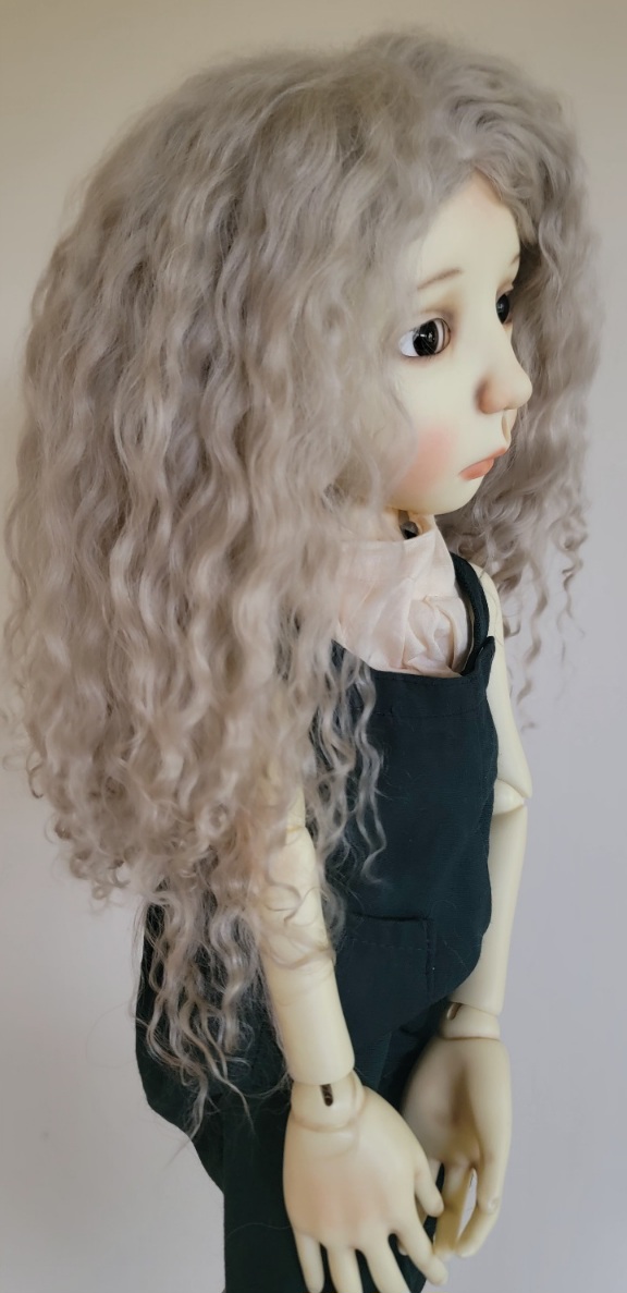 This is an unusually long grey blonde Tibet Mohair wig.  On Stella, she can wear a few bangs behind her ears as show, xoxoxo.  I think this wig will also be perfect for some of the large Meadow Dolls and I will try on my Shy also.